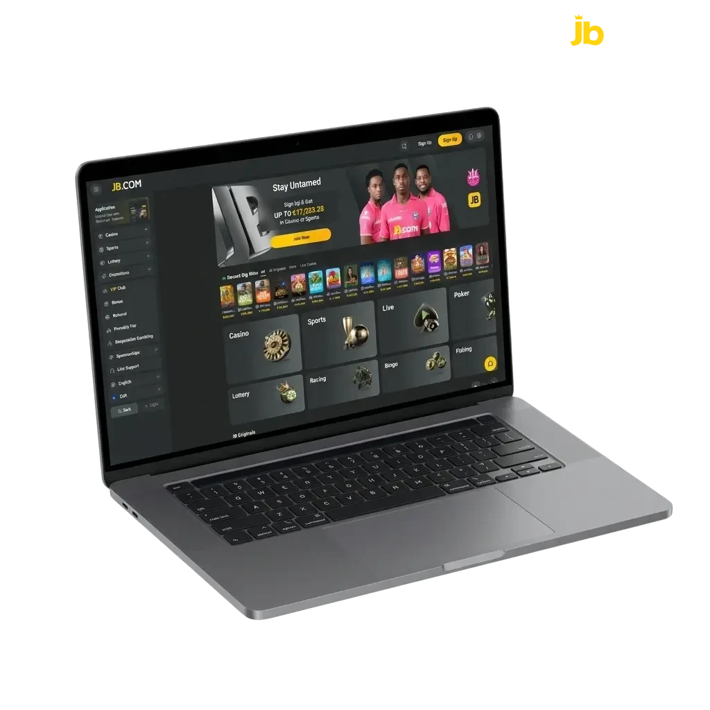 The JB Casino website is designed for intuitive navigation, putting everything you need within reach from the moment you land on the page. The top navigation bar gives you direct access to Sports Betting, Casino, Live Casino, Cybersports, Promotions, and your account area — so you spend less time searching and more time playing.